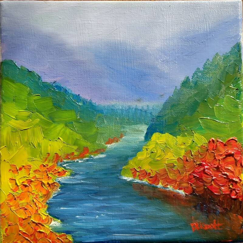 River Landscape is the first of a set of five mini landscapes created specifically for a tabletop arts and craft market in a local town. These cute little mini canvases come with their own dinky display easel, making them perfect to display on shelves, mantlepieces, or in small spaces.
