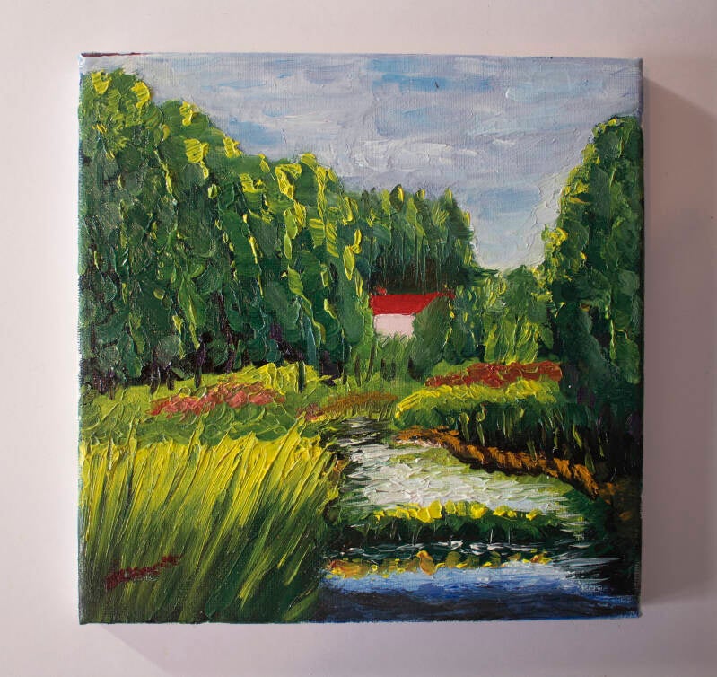 Getting any kind of detail on a canvas this small isn't easy, each tree and its corresponding reflection is just a couple of brushstrokes. Rocks on the shore and the slight ripples along the water's edge are merely dabs with the smallest brush I own. Despite being light on detail the painting works as a whole .