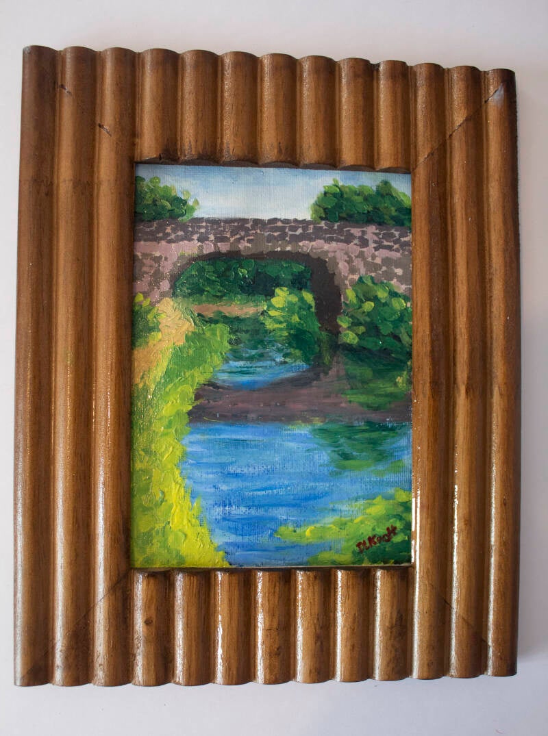 I used soft blended brushwork in the sky and water too keep them looking tranquil. The bold impasto brushwork in the bridge, foliage and pathways, I feel, really bring the piece to life. I may revisit this scene another day and get that pathway right, but for now I'm OK with it's imperfections.